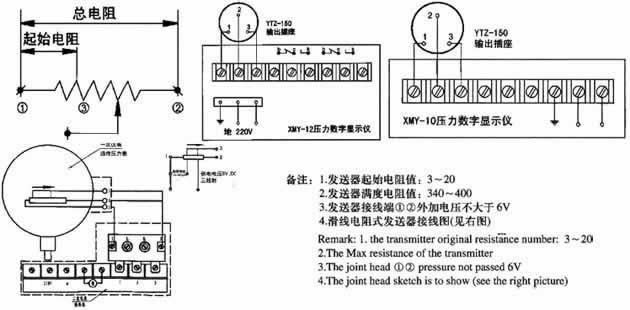 本仪表由一个弹簧管压力表和一个滑线电阻式发送器组成。仪表机械部分的作用原理与一般弹簧管压力表相同。由于电阻发送器系设置在齿轮传动机构上,因此当齿轮传动机构中的扇形齿轮轴产生偏转时,电阻发送器的转臂(电刷)也相应发得以偏转,由于电刷在电阻器上滑行,使行被测压力值的变化换为电阻值的变化,而传至二次仪表,指示出一相应的读数值。同时一次仪表也指示相应的压力值。 |