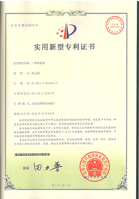热量表实用新型专利证书