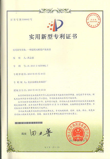 超声波水表实用新型专利证书