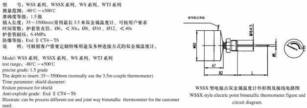 ②WSSX系列电接点双金属温度计能在工作温度达到或过(低于)给予定值时发出信号,还具有现场指示和远传显示功能的一体化温度测量仪表。可用来直接测量气体,液体和物质的温度。一体仪表可现场清晰地看到指示值,又可把信号远传到控制室,起到了一表两用的作用。