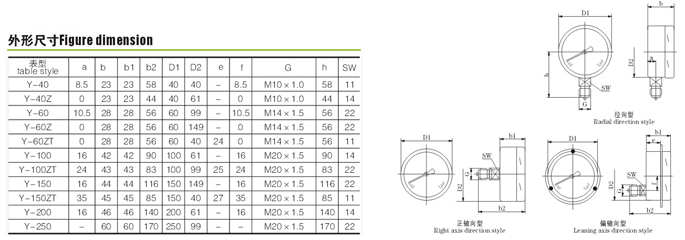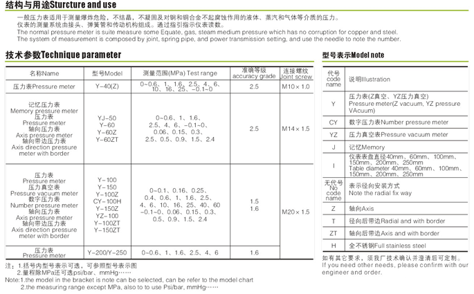 | 压力表 | Y-40(Z) | 0-0.6、1、1.6、2.5、4、6、10、16、25、-0.1-0 | 2.5 | M10*1.0 | ||